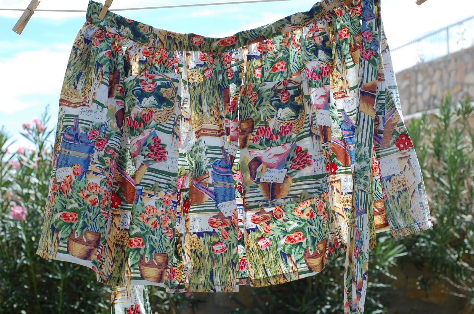 a floral half apron..with flower pots and watering cans. this apron has two large pockets to stash things in.